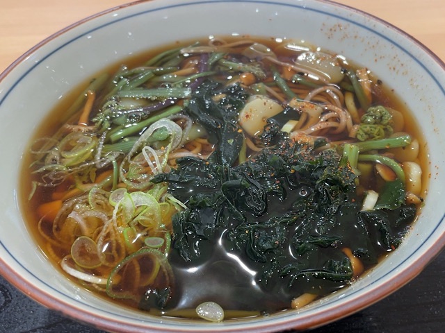 ラーメンとかご飯物は遠慮して山菜きのこそばにしました。