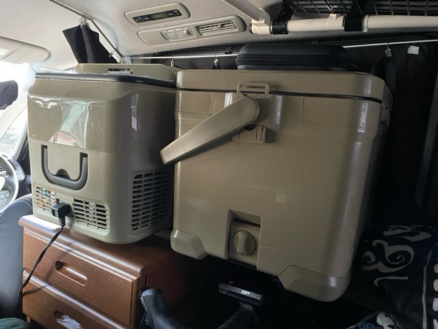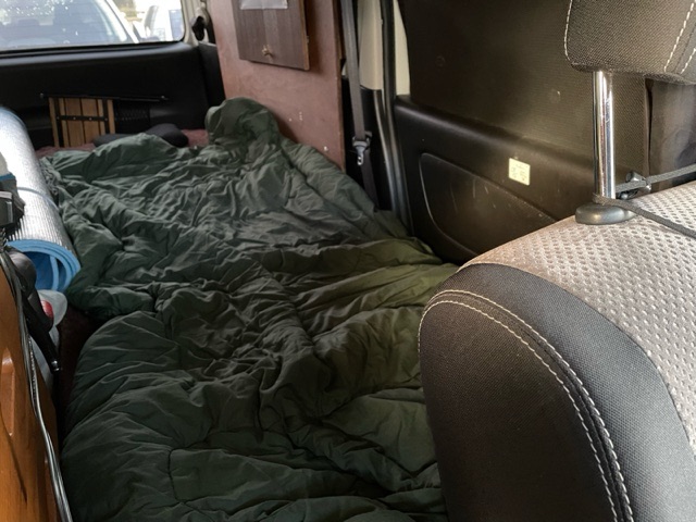今回は冷蔵庫とクーラーの置き場所を作ったので、寝床もバッチリ確保しました。